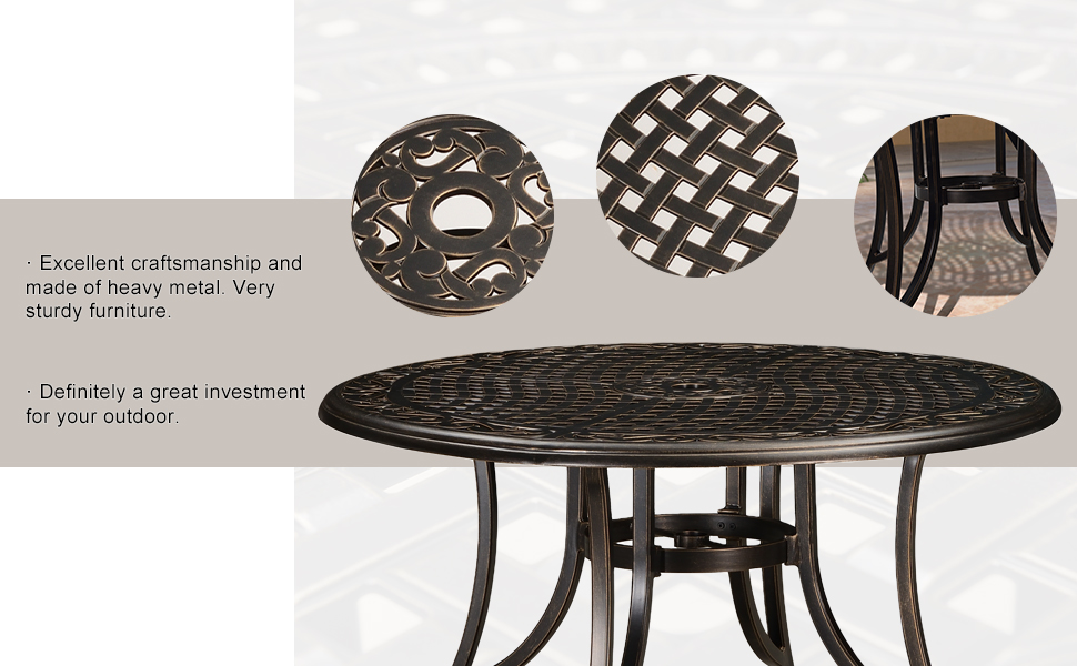 Vintage Design: This outdoor dining set has an antique bronze finish with a beautiful lattice-weave design, which is not only classic but also elegant. This will be the perfect addition to your outdoor space.